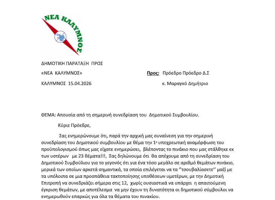 Σε κλίμα έντονης δυσαρέσκειας και με σαφείς αιχμές για τον τρόπο λειτουργίας του Δημοτικού Συμβουλίου Καλυμνίων, η δημοτική παράταξη της μείζονος αντιπολίτευσης«ΝΕΑ ΚΑΛΥΜΝΟΣ» με επικεφαλής τον Ιωάννης Γαλουζή γνωστοποιεί την απόφασή της να απόσχει από τη σημερινή συνεδρίαση,Τετάρτη 15 Απριλίου 2026, με επιστολή προς τον πρόεδρο του σώματος, Δημήτριο Μαραγκό. Η κίνηση αυτή σηματοδοτεί μια νέα φάση αντιπαράθεσης, καθώς η παράταξη καταγγέλλει διαδικασίες που, όπως υποστηρίζει, δεν διασφαλίζουν τον απαιτούμενο χρόνο και τις προϋποθέσεις ουσιαστικής ενημέρωσης και διαβούλευσης επί κρίσιμων θεμάτων.