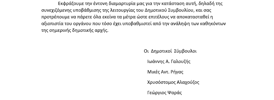 Εκφράζουμε την έντονη διαμαρτυρία μας για την κατάσταση αυτή, δηλαδή της συνεχιζόμενης υποβάθμισης της λειτουργίας του Δημοτικού Συμβουλίου, και σας προτρέπουμε να πάρετε όλα εκείνα τα μέτρα ώστε επιτέλους να αποκατασταθεί η αξιοπιστία του οργάνου που τόσο έχει υποβαθμιστεί από την ανάληψη των καθηκόντων της σημερινής δημοτικής αρχής.