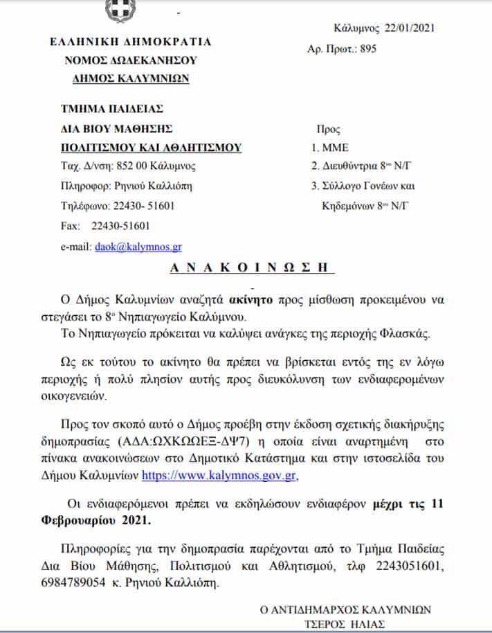 Ο Δήμος Καλυμνίων αναζητά ακίνητο προς μίσθωση προκειμένου να στεγάσει το 8ο Νηπιαγωγείο Καλύμνου. Το Νηπιαγωγείο πρόκειται να καλύψει ανάγκες της περιοχής Φλασκάς