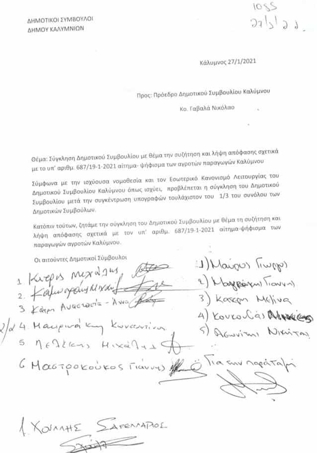 Η αντιπολίτευση ζητά τη σύγκληση του Δημοτικού συμβουλίου Καλύμνου για συζήτηση των προβλημάτων που αντιμετωπίζουν οι παραγωγοί του νησιού.