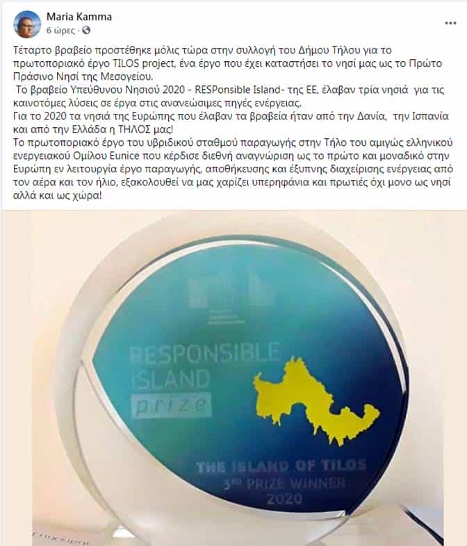 Η ανάρτηση της Δημάρχου Τήλου Μαρίας Καμμά στη προσωπική της σελίδα στο fb