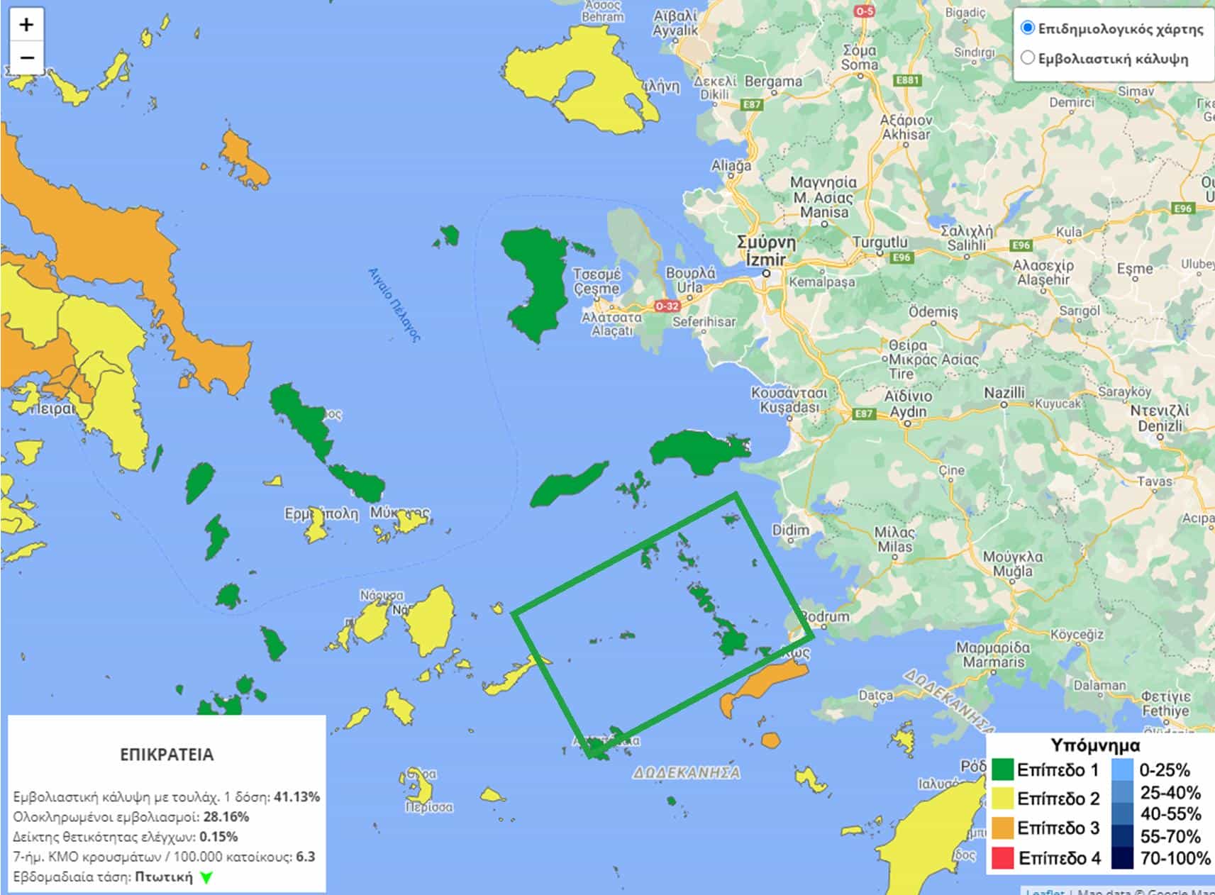 Δόθηκε στη δημοσιότητα ο νέος επικαιροποιημένος Επιδημιολογικός Χάρτης Ελλάδας. με στοιχεία της 16ης Ιουνίου 2021. Η ΠΕ Καλύμνου κατέβηκε από το επίπεδο ΚΙΤΡΙΝΟ στο ΠΡΑΣΙΝΟ ως αποτέλεσμα των μηδενικών κρουσμάτων την τελευταία εβδομάδα και της αύξησης του ποσοστού εμβολιασμών