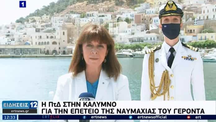 Από το ρεπορτάζ της ΕΡΤ1 και της δημοσιογράφου Χρύσας  Ρουμελιώτη για την επίσκεψη της Πρόεδρου της Δημοκρατίας Κατερίνας Σακελλαροπούλου στην Κάλυμνο, στο πλαίσιο των εορταστικών εκδηλώσεων της επετείου της  Ναυμαχίας του Γέροντα.