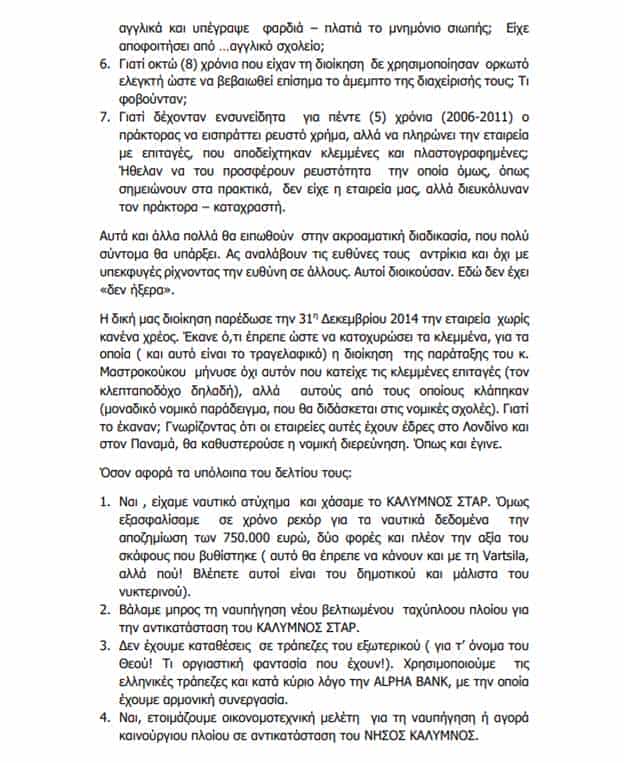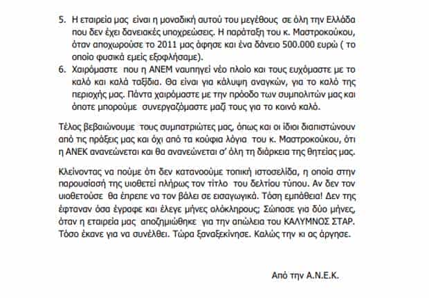 Δεν θα μπούμε στον κόπο να του απαντήσουμε σε αυτό το δημοσίευμα στην ανόητη και γελοία αναφορά του. Όταν εμείς παραθέτουμε αδιάσειστα στοιχεία για τα «έργα και τις ημέρες του» ως έμμισθου και καλοπληρωμένου Προέδρου στην ΑΝΕΚ και τη διασπάθιση του χρήματος της Εταιρείας , αυτός επιδίδεται σε ύβρεις, υπονοούμενα και ανόητες αναφορές μέσα από τη σελίδα του στο fb, για να πάρει κάποια like από το γνωστό περίγυρο του.