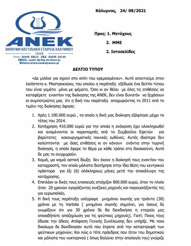 Με δελτίο τύπου που φέρει χθεσινή ημερομηνία 24 Αυγούστου 2021, και στάλθηκε σήμερα, η ΑΝΕΚ απαντά σε αντίστοιχο που εκδόθηκε χθες από την Παράταξη του Ι.Μαστροκούκου με τίτλο: Γιγαντώνεται η Ναυτιλιακή Εταιρία Δήμου Κω (Α.Ν.Ε.Μ.). Ναυαγεί η Ναυτιλιακή Εταιρία Δήμου Καλυμνίων (Α.Ν.Ε.Κ).