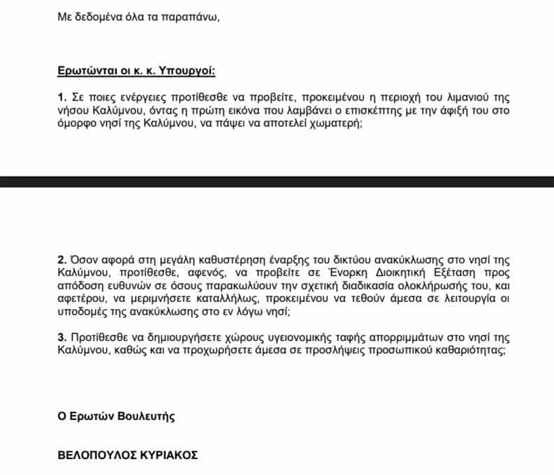 Δημιουργείται το εύλογο ερώτημα, αν η ενέργεια αυτή του Κυριάκου Βελόπουλου έγινε με δική του πρωτοβουλία και εν αγνοία του Δημάρχου Καλυμνίων ή προηγουμένως ενημερώθηκε ο Δήμος Καλυμνίων;