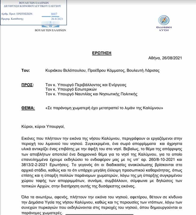 Την ερώτηση που έχει θέμα “Σε παράνομη χωματερή έχει μετατραπεί το λιμάνι της Καλύμνου” ο Κυριάκος Βελόπουλος την απευθύνει στους Υπουργούς Περιβάλλοντος και Ενέργειας , Εσωτερικών , Ναυτιλίας και Νησιωτικής Πολιτικής.