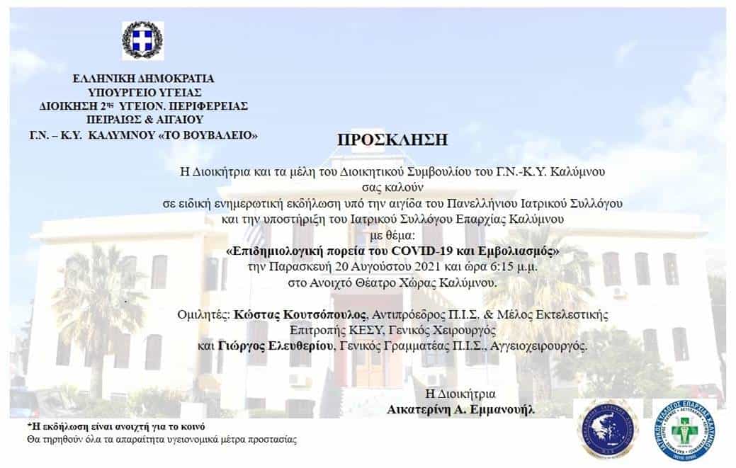 Μία ενδιαφέρουσα εκδήλωση διοργανώνει το Γ.Ν.-Κ.Υ. Καλύμνου στο Ανοιχτό Θέατρο Χώρας με θέμα «Επιδημιολογική πορεία του COVID-19 και Εμβολιασμός» την Παρασκευή 20 Αυγούστου 2021 και ώρα 6:15 μ.μ.