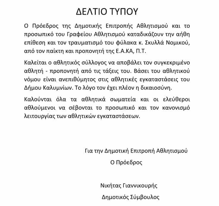 Με δελτίο τύπου ο Πρόεδρος της Δημοτικής Επιτροπής Αθλητισμού και το προσωπικό του Γραφείου Αθλητισμού καταδικάζουν την αήθη επίθεση και τον τραυματισμό του φύλακα Νομικού Σκυλλά, από τον παίκτη και προπονητή της Ε.Α.ΚΑ