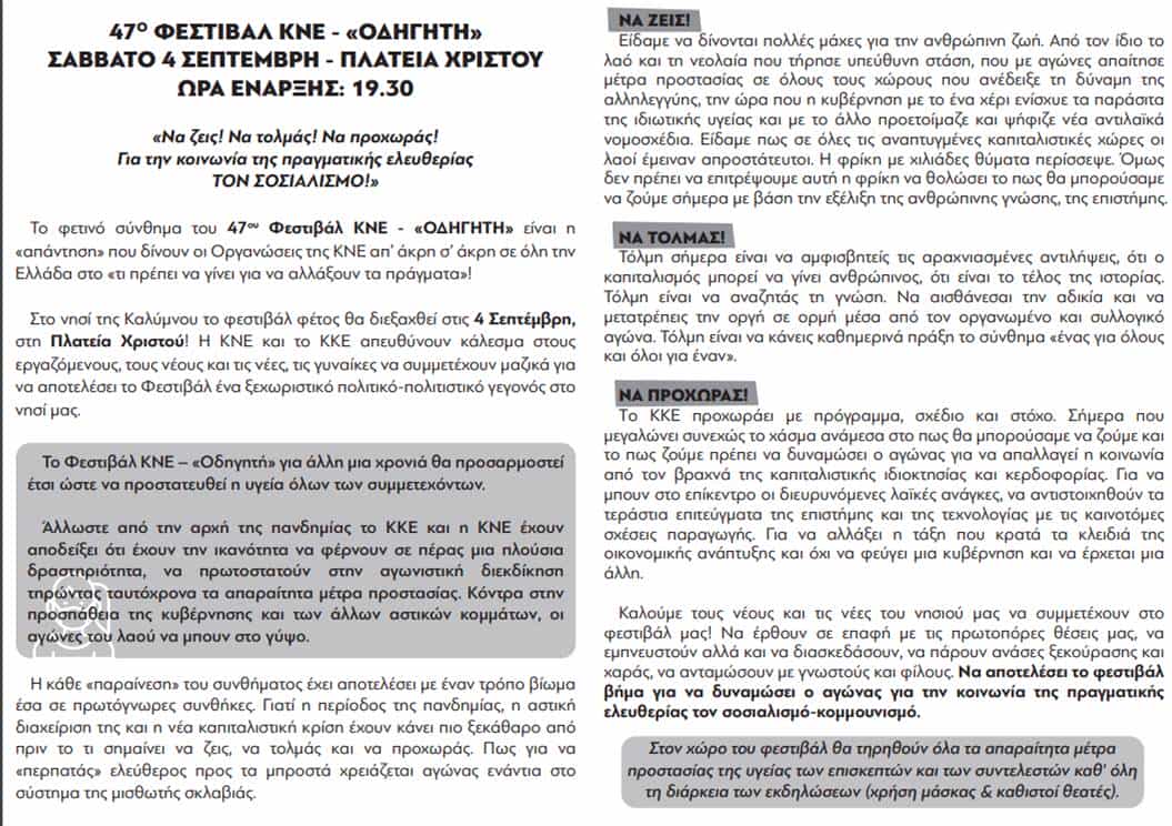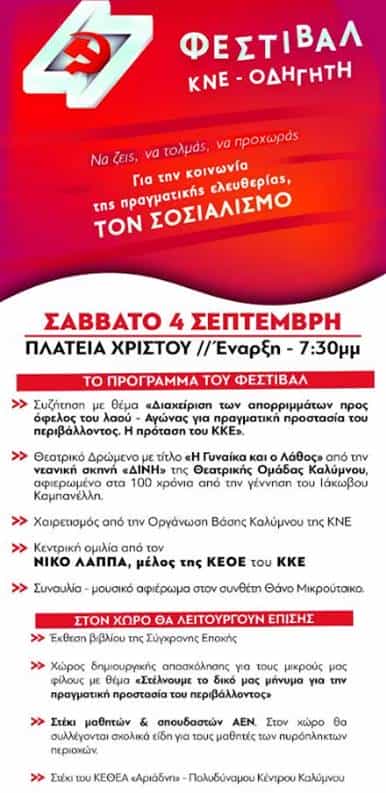 Παραθέτουμε το κάλεσμα της Οργάνωσης Βάσης Καλύμνου της ΚΝΕ και η αφίσα με το πρόγραμμα των εκδηλώσεων.