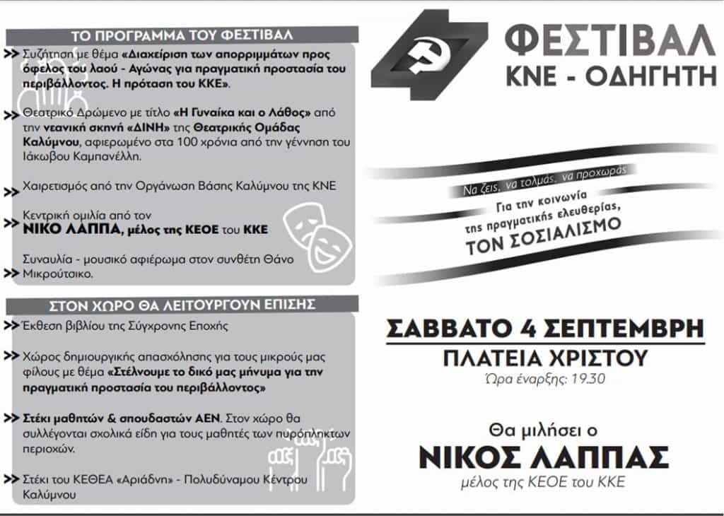Το Σάββατο 4 Σεπτέμβρη 2021, στην Πλατεία Χριστού θα πραγματοποιηθεί η στάση του 47ου ΦΕΣΤΙΒΑΛ ΚΝΕ- ΟΔΗΓΗΤΗ στο νησί της Καλύμνου.