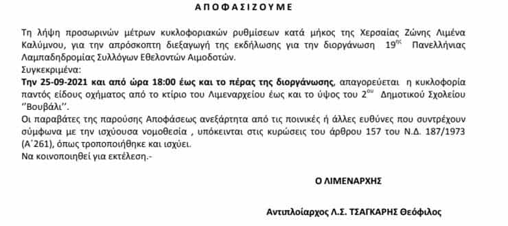 Προσωρινά μέτρα ρύθμισης κυκλοφορίας από το Λιμεναρχείο Καλύμνου στο λιμάνι για τη 19η Πανελλήνια Λαμπαδηδρομία συλλόγων Εθελοντών Αιμοδοτών το Σάββατο 25 Σεπτεμβρίου 2021 από τις 6.00 το απόγευμαι μέχρι την λήξη