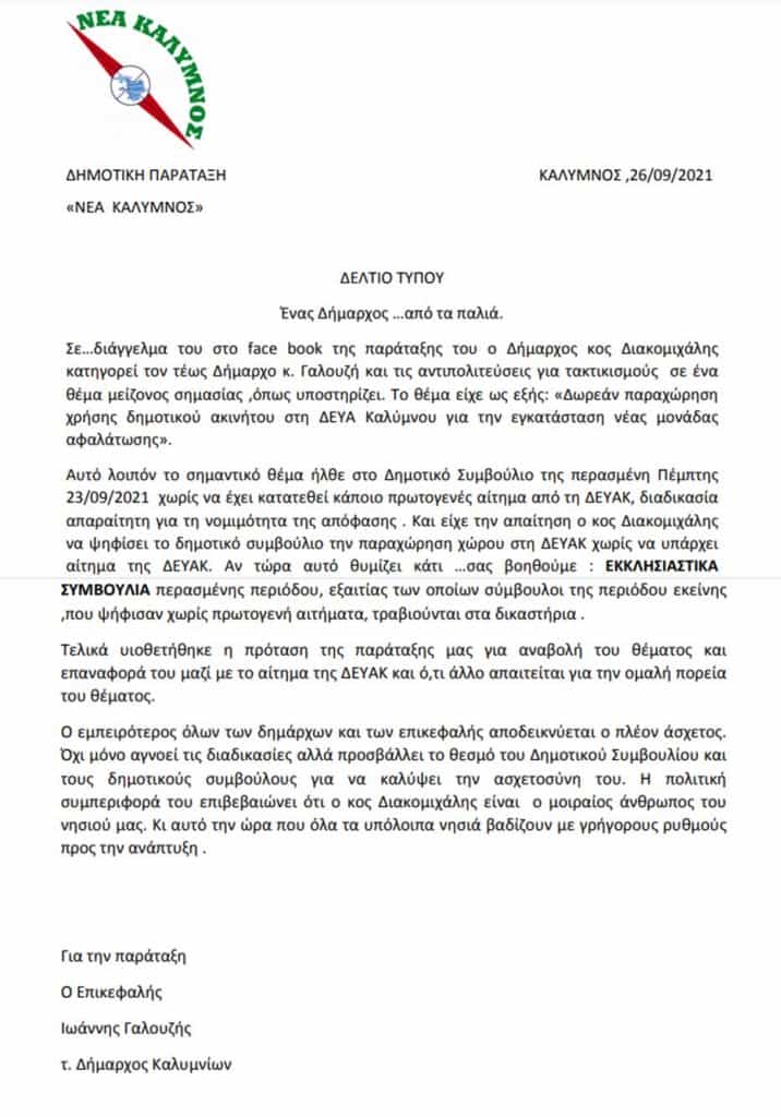 Με δελτίο τύπου της Παράταξης «ΝΕΑ ΚΑΛΥΜΝΟΣ» που υπογράφει ο επικεφαλής και τέως Δήμαρχος Ιωάννης Γαλουζής και φέρει τίτλο «Ένας Δήμαρχος …από τα παλιά» δίνεται απάντηση στο Δ.Διακομιχάλη για όσα είπε σε «διάγγελμα» του που αναρτήθηκε στη σελίδα της παράταξης του στο fb.