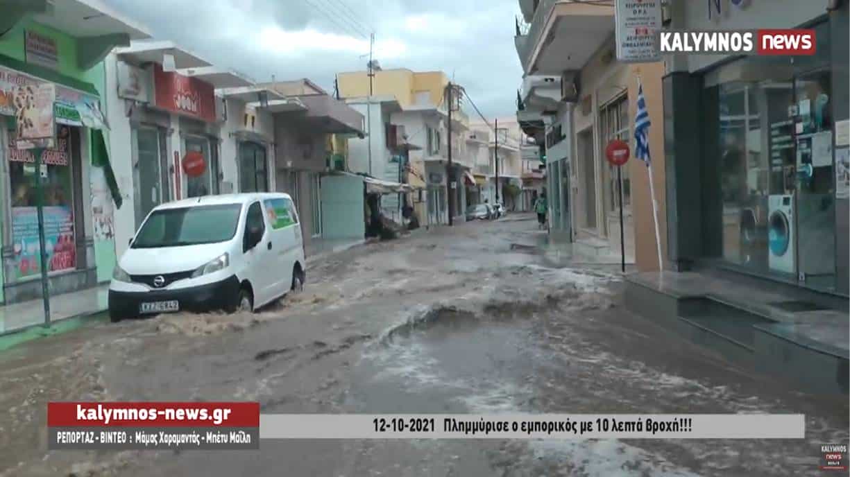 Η μεσημεριανή βροχή σήμερα Τρίτη 12 Οκτωβρίου 2021, διάρκειας 10 λεπτών, ήταν αρκετή για να μετατραπεί ο εμπορικός δρόμος της Πόθιας Καλύμνου σε ένα απροσπέλαστο ποτάμι.