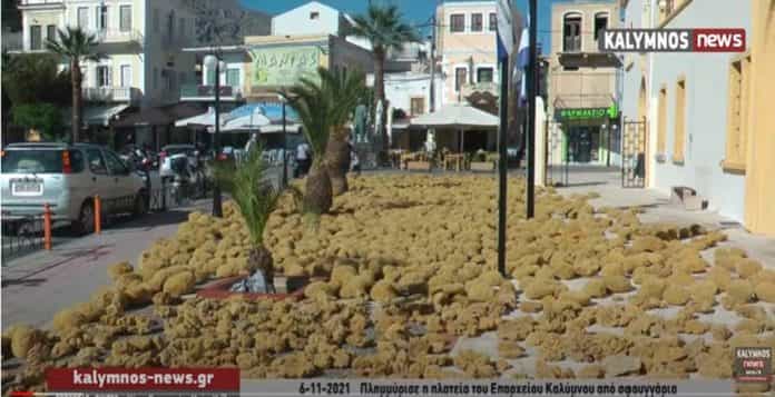 Μία εντυπωσιακή εικόνα που μόνο στην Κάλυμνο μπορείς να συναντήσεις ,”σήμα κατατεθέν” για το νησί, κατέγραψε ο φακός του kalymnos-news.gr χθες Σάββατο πρωί 6 Νοεμβρίου 2021 με σφουγγάρια που έπιασαν Καλύμνιοι σφουγγαράδες, να έχουν απλωθεί στην πλατεία μπροστά από το κτίριο του Επαρχείου.