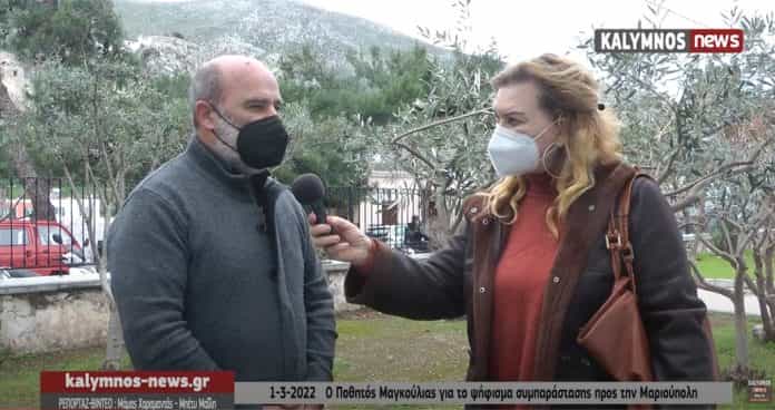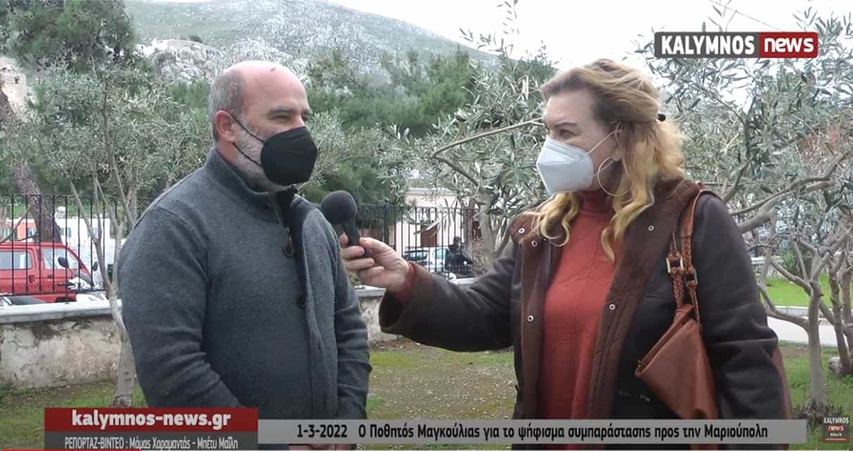 Στο kalymnos-news.gr μίλησε σήμερα Τρίτη 1 Μαρτίου 2022 ο τέως Πρόεδρος του ΔΣ και δημοτικός σύμβουλος Ποθητός Μαγκούλιας με αφορμή την πρόταση του, για έκδοση ψηφίσματος από το Δημοτικό Συμβούλιο Καλύμνου, συμπαράστασης στην Ουκρανία και την πόλη της Μαριούπολης.