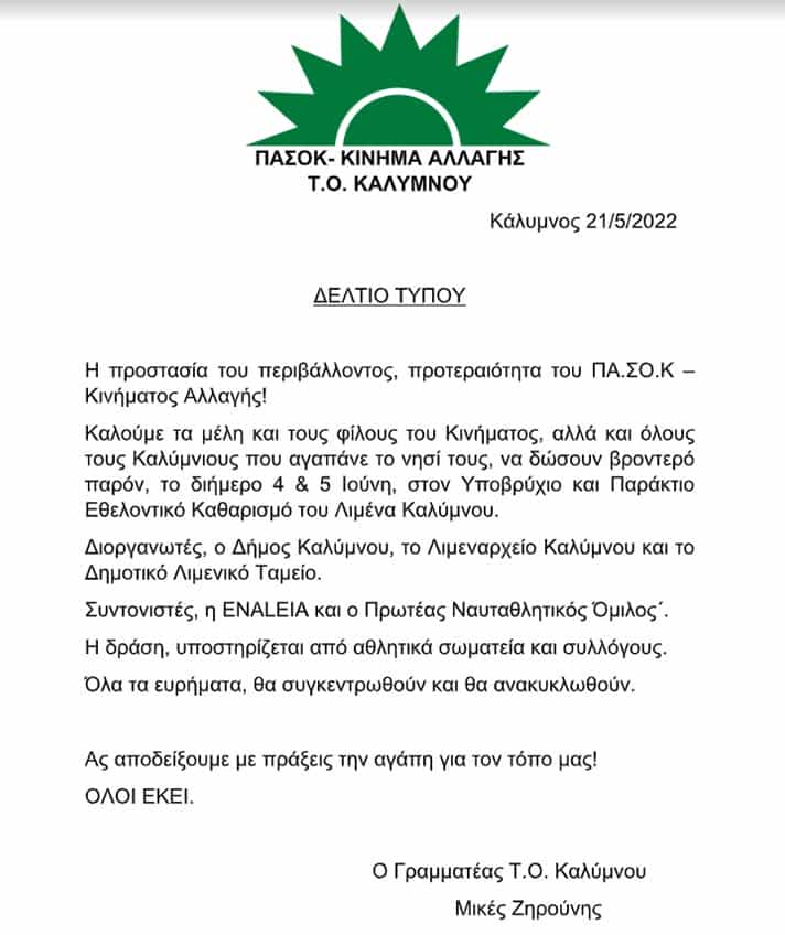 Πρόσκληση από Τ.Ο Καλύμνου ΠΑΣΟΚ –ΚΙΝΗΜΑ ΑΛΛΑΓΗΣ για συμμετοχή στον Εθελοντικό Καθαρισμό Λιμένα Καλύμνου.