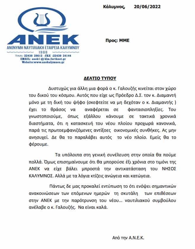 Με αφορμή τα όσα είπε  ο τέως Δήμαρχος Ιωάννης Γαλουζής σε συνέντευξη του στο kalymnos-news.gr  για την ΑΝΕΚ και την επισήμανση του, ότι θα έπρεπε ο Πρόεδρος της Εταιρείας να ενημερώσει  το Δημοτικό συμβούλιο για το πόσο θα στοιχίσει το νέο σκάφος και ποιά η πορεία κατασκευής του, εκδόθηκε από την ΑΝΕΚ το παρακάτω δελτίο τύπου.