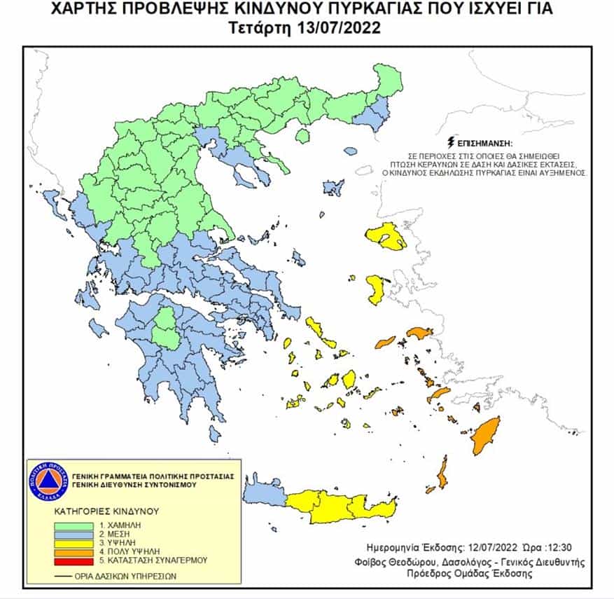 Πολύ υψηλός κίνδυνος πυρκαγιάς (κατηγορία κινδύνου 4) προβλέπεται για αύριο Τετάρτη 13 Ιουλίου 2022, σύμφωνα με τον Χάρτη Επικινδυνότητας που εκδίδει η Γενική Γραμματεία Πολιτικής Προστασίας του Υπουργείου Κλιματικής Κρίσης & Πολιτικής Προστασίας.