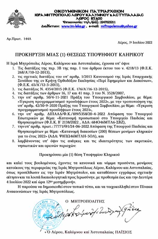 Προκήρυξη μίας θέσης κληρικού από την Ιερά Μητρόπολη Λέρου,Καλύμνου και Αστυπαλαίας