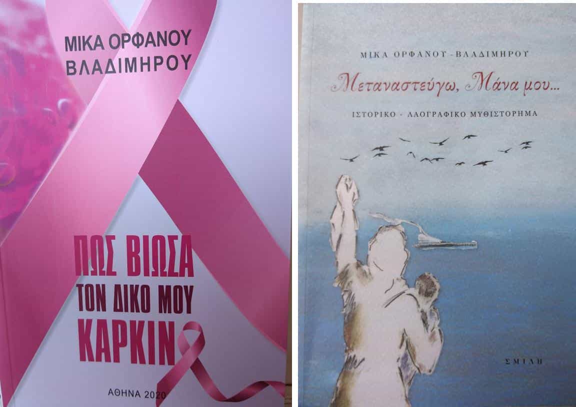 Η συμπατριώτισσά μας κ. Μίκα Ορφανού- Βλαδίμηρου κυκλοφόρησε το πρώτο της μυθιστόρημα με τίτλο “ΜΕΤΑΝΑΣΤΕΥΩ, ΜΑΝΑ”. Ήρθε να προστεθεί σε μια αξιόλογη δική της Μελέτη – Εξομολόγηση, με τίτλο: “ΠΩΣ ΒΙΩΣΑ ΤΟΝ ΔΙΚΟ ΜΟΥ ΚΑΡΚΙΝΟ” , όπου, μέσα από τη φοβερή περιπέτεια της υγείας της, ένιωσε το χρέος να “αφυπνίσει την ευθύνη” όλων μας για έναν αγώνα ενημέρωσης, πρόληψης και θεραπείας της επάρατης νόσου. Όπως, επίσης, “να προσφέρει στις αναγνώστριές της περισσότερη γνώση, ελπίδα και δύναμη “. Κανένας άλλος δεν μπορεί να πείσει περισσότερο τις γυναίκες για τις αιτίες που προκαλούν την εμφάνιση του συγκεκριμένου καρκίνου του μαστού και τη θεραπεία του, όσο εκείνη ως γιατρός, η οποία έπαθε, νόσησε, πάλεψε και νίκησε. Το βιβλίο αυτό, αν και φέρει τη σφραγίδα της βαθιάς επιστημονικής γνώσης, είναι απλό, εύληπτο και κατανοητό. Σε μόλις 130 σελίδες, μικρού μεγέθους, ο αναγνώστης θα βρει απαντήσεις σε κάθε του απορία, αλλά κυρίως την ελπίδα, το θάρρος και τη δύναμη να νικήσει έναν εχθρό που φαίνεται ακατανίκητος, ενώ δεν είναι. Το έργο αυτό, δώρο αγάπης, έγνοιας και προσφοράς στη γυναίκα από τη δική μας συγγραφέα, δεν πρέπει να λείπει από κανένα σπίτι.