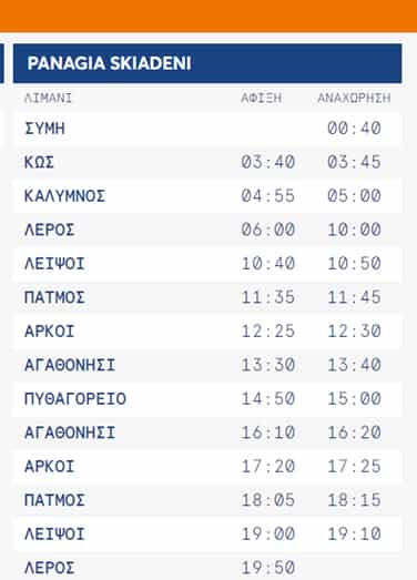 Από το λιμάνι της Καλύμνου αναχώρησε στις 05.30 το πρωί με προορισμό το λιμάνι της Αγίας Μαρίνας Λέρου. Στη Λέρο αναμένεται να παραμείνιε περίπου 4 ώρες και θα αναχωρήσει στις 10.00 το πρωί για συνέχιση του δρομολογίου του προς Πυθαγόρεια Σάμου με ενδιάμεσα λιμάνια προσέγγισης ΛΕΙΨΟΙ-ΠΑΤΜΟΣ-ΑΡΚΙΟΙ-ΑΓΑΘΟΝΗΣΙ-ΠΥΘΑΓΟΡΕΙΟ ΣΑΜΟΥ και επιστροφή αντίστροφα μέχρι ΛΕΡΟ.