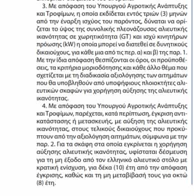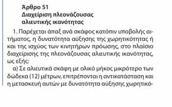 Δημοσιεύτηκε στο ΦΕΚ στις 28 Μαρτίου 2023, ο νόμος υπ’ αριθμ. 5035 που στο άρθρο του 51 περιλαμβάνει σχετική διάταξη “Διαχείριση πλεονάζουσας αλιευτικής ικανότητας” με την οποία ρυθμίζεται ένα χρόνιο αίτημα των αλιέων για την αύξηση χωρητικότητας και ιπποδύναμης στα αλιευτικά σκάφη.