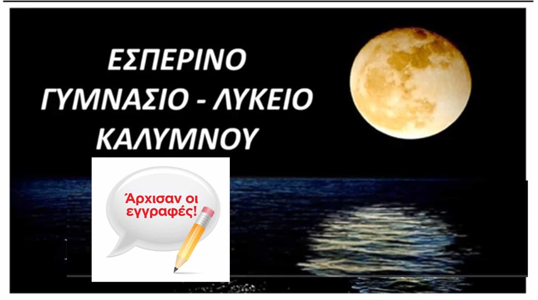 Το Εσπερινό Γυμνάσιο με Λυκειακές τάξεις Καλύμνου ενημερώνει τους ενδιαφερόμενους πως οι εγγραφές για το σχολικό έτος 2023-2024 ξεκίνησαν. Οι ενδιαφερόμενοι μπορούν να προσέρχονται για εγγραφή καθημερινά στο σχολείο μας, στην Ανάσταση (συστεγαζόμαστε με το 2ο Λύκειο, το παλιό Θηλέων), απογευματινές ώρες 18:30-20:30μμ. Τηλ: 22430-23448