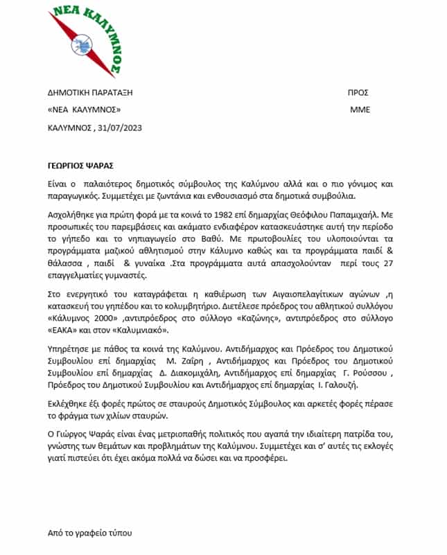 Ο Γιώργος Ψαράς συνεχίζει στο πλευρό του Γιάννη Γαλουζή και θα συμμετέχει στο ψηφοδέλτιο της Παράταξης “ΝΕΑ ΚΑΛΥΜΝΟΣ” στις εκλογές της 8ης Οκτωβρίου 2023.