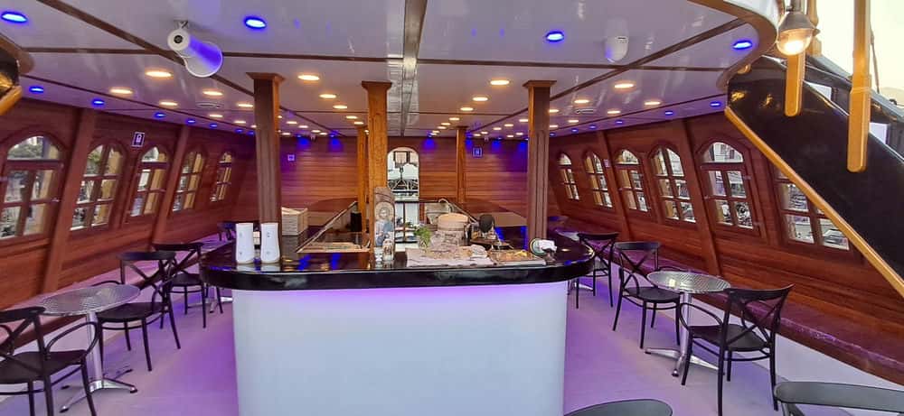 Διαθέτει: Γέφυρα με υπερσύγχρονα μέσα πλοήγησης- μοντέρνους και άνετους εσωτερικούς και εξωτερικούς χώρους, 2 εντυπωσιακά μπαρ, μαγειρείο, σύγχρονες τουαλέτες (3 ανδρών και 3 γυναικών)