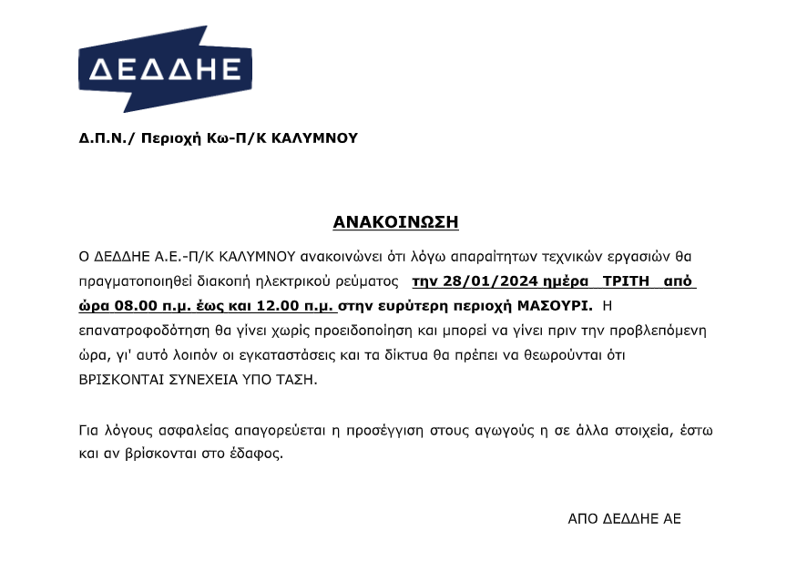 Προσωρινή διακοπή ηλεκτροδότησης στο Μασούρι την Τρίτη 28 Ιανουαρίου 2025.