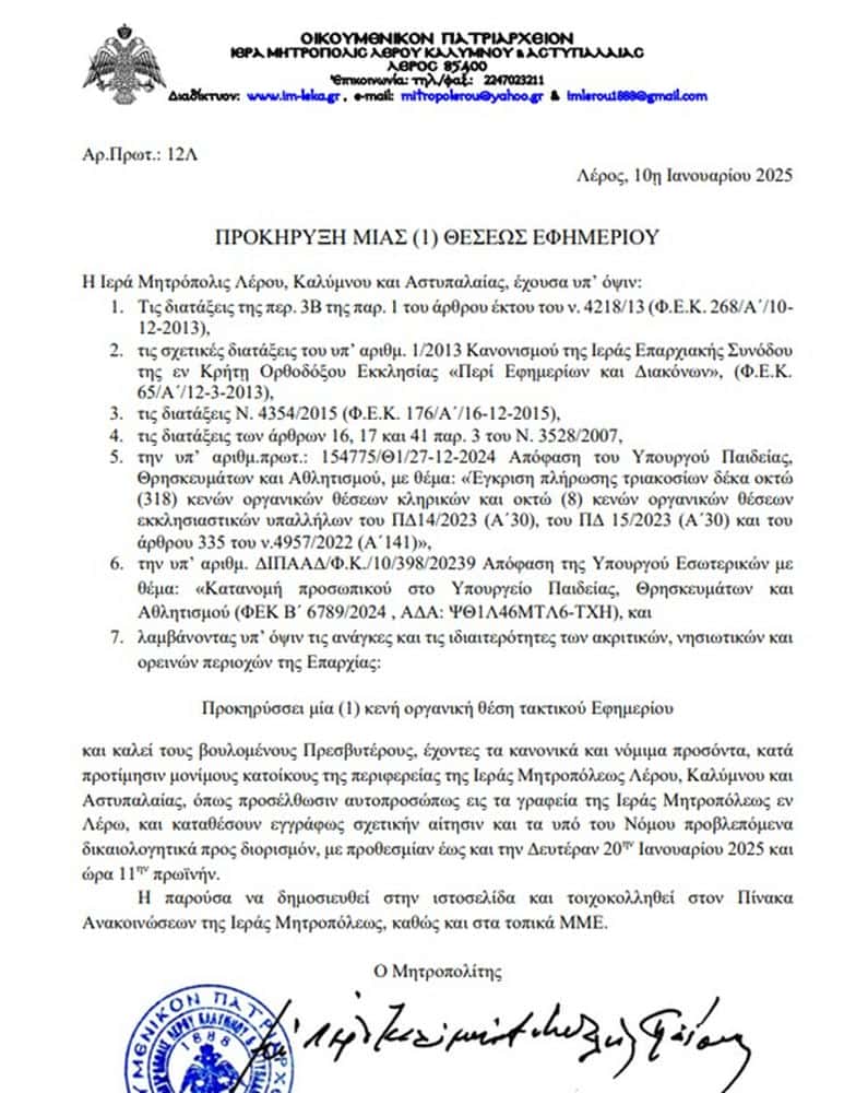 Η Ιερά Μητρόπολη Λέρου, Καλύμνου και Αστυπαλαίας ανακοίνωσε επίσημα την προκήρυξη μιας (1) οργανικής θέσης τακτικού Εφημέριου, με σκοπό την κάλυψη των αναγκών της τοπικής Εκκλησίας και την ενίσχυση της πνευματικής ζωής των πιστών.