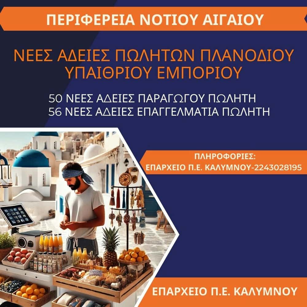 Ο Έπαρχος της Περιφερειακής Ενότητας Καλύμνου, Μανώλης Μουσελλής, ανακοίνωσε τη δημοσίευση της προκήρυξης για τη χορήγηση νέων αδειών υπαίθριου πλανόδιου εμπορίου. Η Περιφέρεια Νοτίου Αιγαίου, σε εφαρμογή του ν. 4849/2021, όπως ισχύει, προχωρά στη χορήγηση: