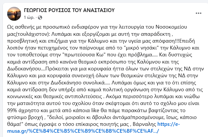 Οργισμένη ανάρτηση του πρώην Δημάρχου Γεωργίου Ρούσσου για την μετακίνηση του Νικόλαου Φανιού από το Νοσοκομείο Καλύμνου σε αυτό της Κω.