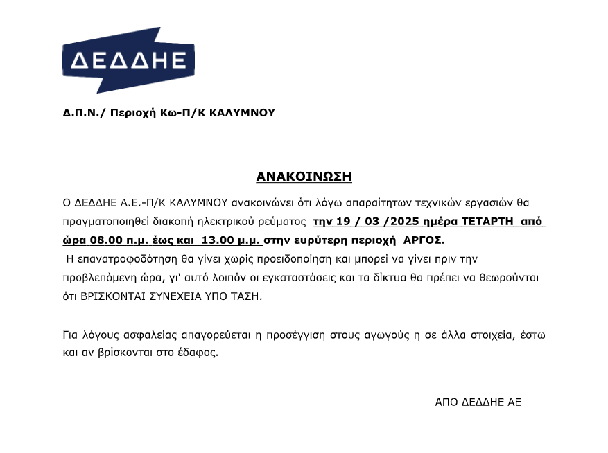 Προσωρινή διακοπή ηλεκτροδότησης την Τετάρτη 19 Μαρτίου στην περιοχή Άργους Καλύμνου