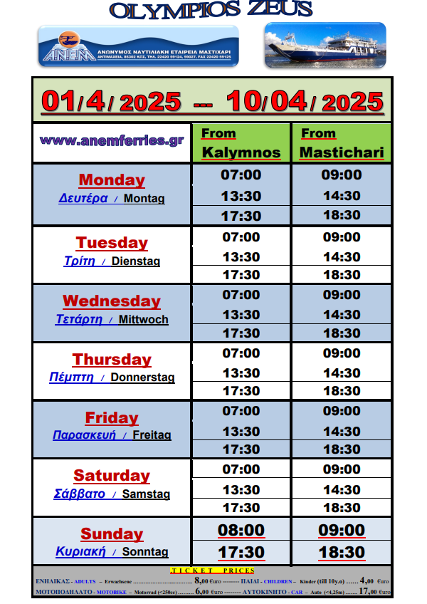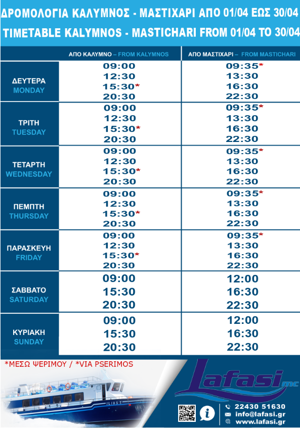 Τα δρομολόγια Κάλυμνος-Μαστιχάρι με επιστροφή από “ΟΛΥΜΠΙΟΣ ΖΕΥΣ” και “ΗΛΙΑΣ Τ” για τον Απρίλιο.