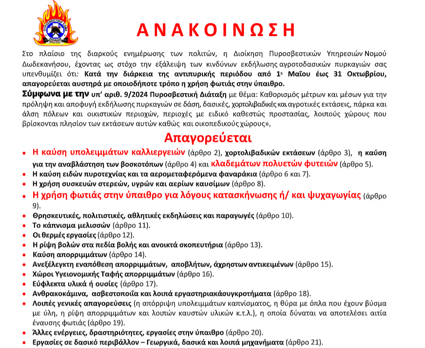 Η Διοίκηση Πυροσβεστικών Υπηρεσιών Νομού Δωδεκανήσου, με γνώμονα την πρόληψη αγροτοδασικών πυρκαγιών και την προστασία του φυσικού και ανθρώπινου περιβάλλοντος, υπενθυμίζει στους πολίτες ότι κατά τη διάρκεια της αντιπυρικής περιόδου (1 Μαΐου – 31 Οκτωβρίου) ισχύουν αυστηρές απαγορεύσεις στη χρήση φωτιάς στην ύπαιθρο. Οι απαγορεύσεις καλύπτουν σειρά δραστηριοτήτων, όπως καύσεις υπολειμμάτων καλλιεργειών, χρήση πυροτεχνημάτων, θερμές εργασίες και άλλες ενέργειες που ενδέχεται να προκαλέσουν πυρκαγιά, όπως προβλέπεται από την Πυροσβεστική Διάταξη υπ’ αριθ. 9/2024.