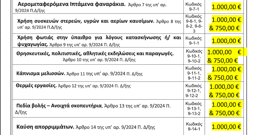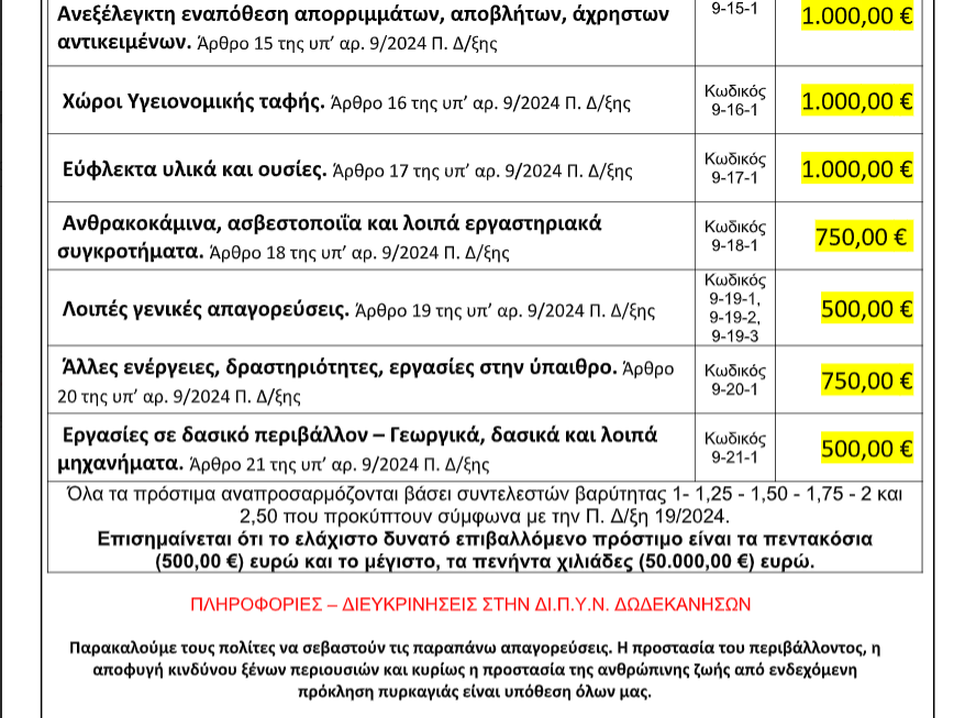 Επίσης στο πλαίσιο της προστασίας της ζωής, της περιουσίας και του φυσικού περιβάλλοντος, η Διοίκηση Πυροσβεστικών Υπηρεσιών Νομού Δωδεκανήσου ενημερώνει τους πολίτες ότι κατά την αντιπυρική περίοδο επιβάλλονται αυστηρά διοικητικά πρόστιμα για κάθε παράβαση των προβλεπόμενων απαγορεύσεων, βάσει της Πυροσβεστικής Διάταξης υπ’ αριθ. 19/2024. Τα πρόστιμα κυμαίνονται από 500 έως 50.000 ευρώ, αναλόγως της βαρύτητας της παράβασης. Η συμμόρφωση αποτελεί κοινωνική ευθύνη όλων μας