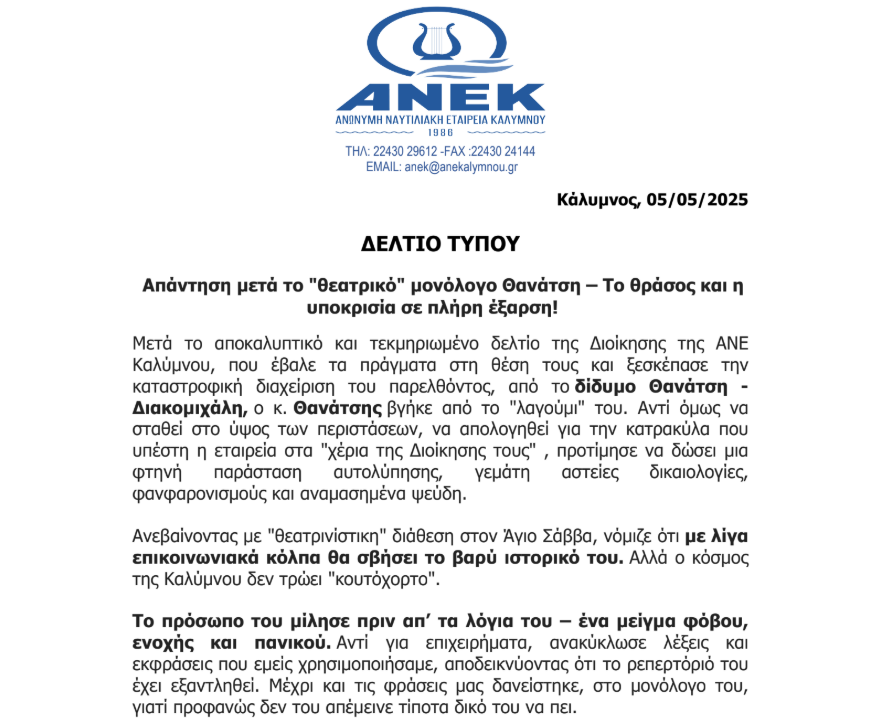 Με ιδιαίτερα αιχμηρή γλώσσα απαντά η Διοίκηση της ΑΝΕ Καλύμνου στον πρώην πρόεδρο της εταιρείας, Γεώργιο Θανάτση, κατηγορώντας τον για «θεατρινίστικο μονόλογο» και «πλήρη αποφυγή ουσιαστικής απάντησης» στα σοβαρά ζητήματα κακοδιαχείρισης που, όπως υποστηρίζει, σημάδεψαν την προηγούμενη διοίκηση.