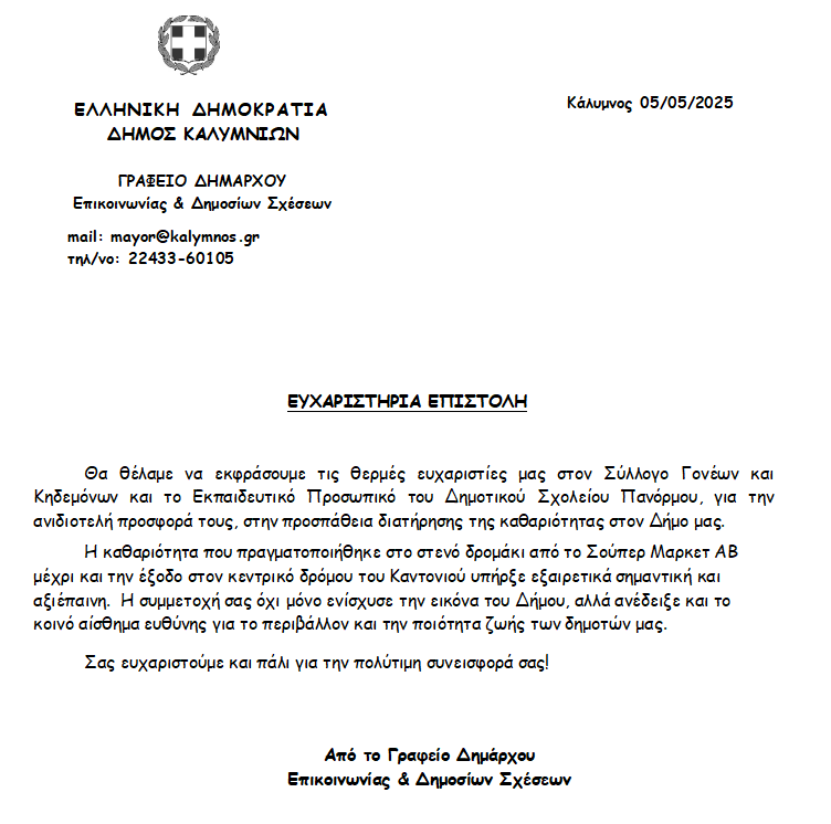 Ευχαριστήριο Δήμου Καλυμνίων προς το Δημοτικό Σχολείο Πανόρμου για τη συμβολή στην καθαριότητα