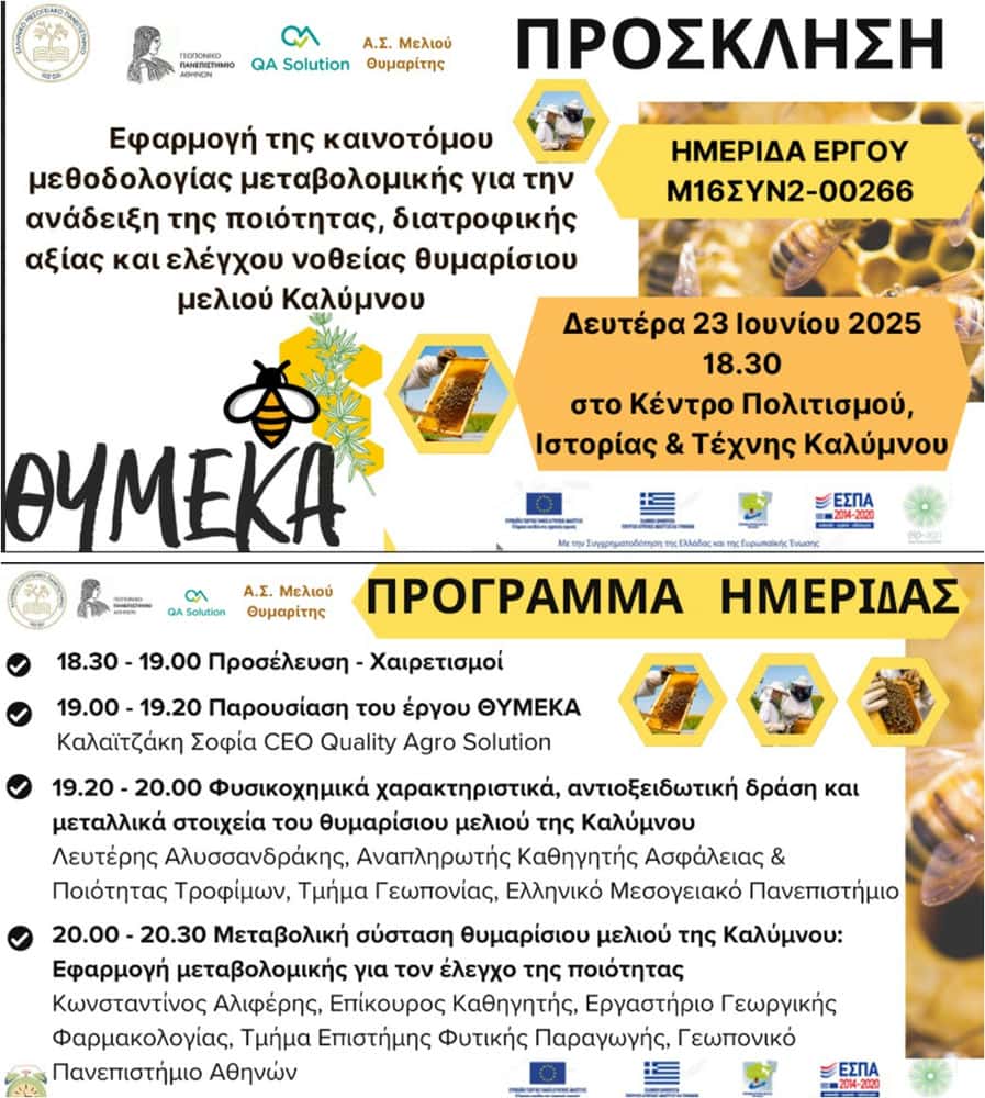 Σας ενημερώνουμε ότι τη Δευτέρα 23 Ιουνίου 2025 και ώρα 18:30 θα πραγματοποιηθεί επιστημονική Ημερίδα στο Κέντρο Πολιτισμού, & Ιστορίας Καλύμνου, με αντικείμενο την παρουσίαση του ερευνητικού έργου ΘΥΜΕΚΑ: «Εφαρμογή της καινοτόμου μεθοδολογίας μεταβολομικής για την ανάδειξη της ποιότητας, διατροφικής αξίας και ελέγχου νοθείας θυμαρίσιου μελιού Καλύμνου».