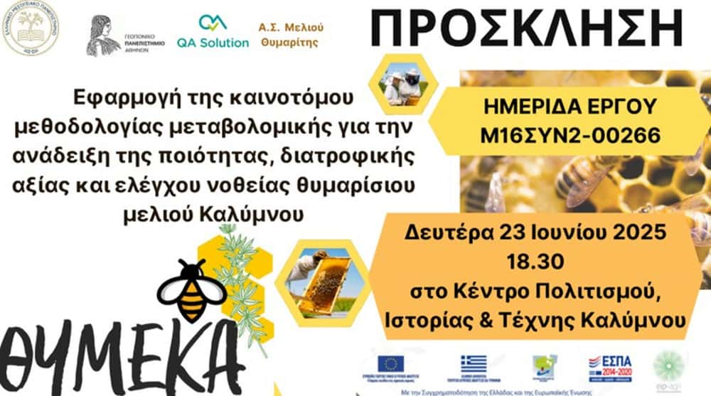 Σας ενημερώνουμε ότι τη Δευτέρα 23 Ιουνίου 2025 και ώρα 18:30 θα πραγματοποιηθεί επιστημονική Ημερίδα στο Κέντρο Πολιτισμού, & Ιστορίας Καλύμνου, με αντικείμενο την παρουσίαση του ερευνητικού έργου ΘΥΜΕΚΑ: «Εφαρμογή της καινοτόμου μεθοδολογίας μεταβολομικής για την ανάδειξη της ποιότητας, διατροφικής αξίας και ελέγχου νοθείας θυμαρίσιου μελιού Καλύμνου».