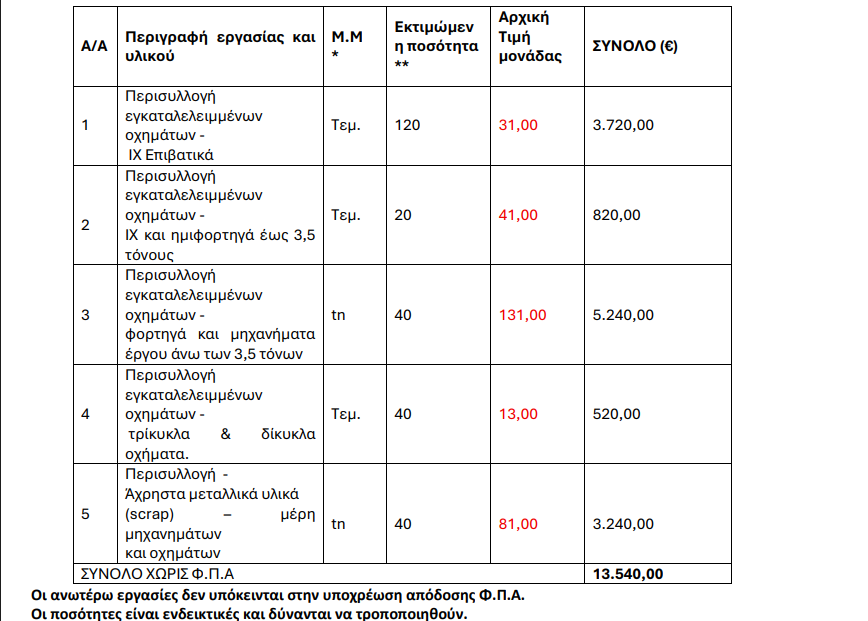 Ο Χαράλαμπος Σακαντάρης αναδείχθηκε ανάδοχος του έργου έπειτα από σχετικό διαγωνισμό, καθώς ήταν ο μοναδικός συμμετέχων και υπέβαλε συνολική προσφορά ύψους 13.540,00 ευρώ για την εκποίηση παλαιών οχημάτων και άχρηστου μεταλλικού υλικού που βρίσκονται εντός των διοικητικών ορίων του Δήμου Καλυμνίων. Το σύνολο των υλικών θα παραδοθεί σε εγκεκριμένο σημείο συλλογής ΟΚΤΖ. Η περιγραφή του υλικού, η εκτιμώμενη ποσότητα και η τιμή μονάδας που προσφέρθηκε φαίνονται στον παρακάτω πίνακα: