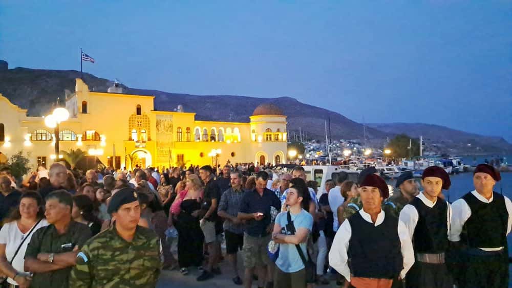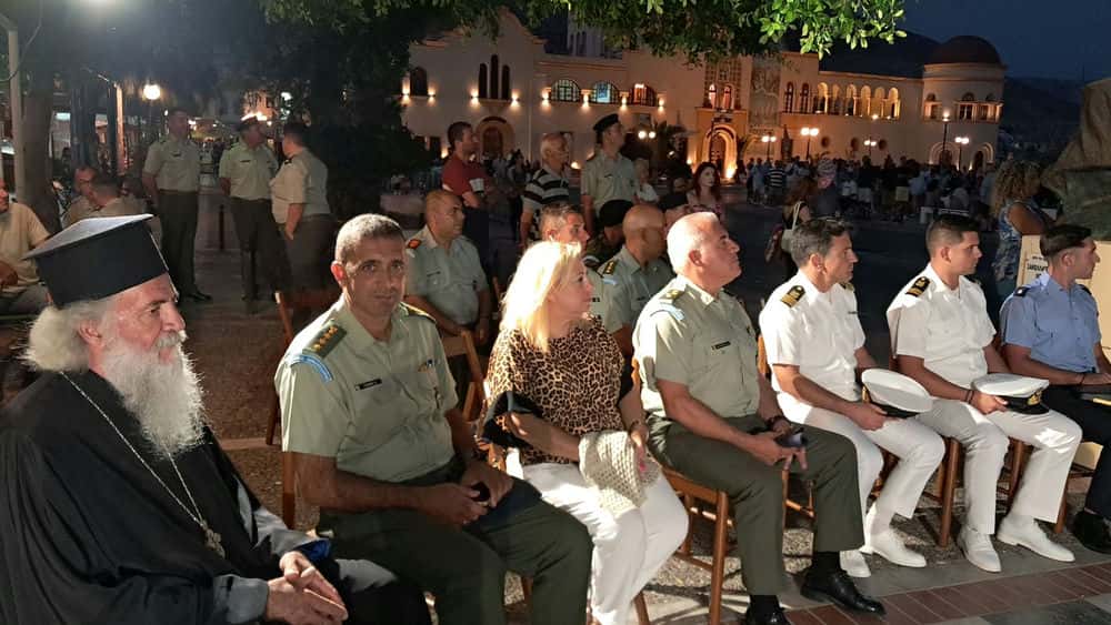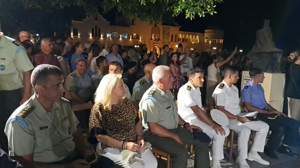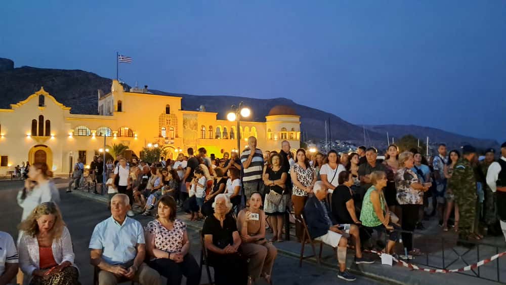 Από τον προαύλιο χώρο του Κέντρου Πολιτισμού οι επίσημοι, παρακολούθησαν την εκδήλωση. Παρέστησαν η βουλευτής Δωδεκανήσου της ΝΔ Μίκα Ιατρίδη, ο Δήμαρχος Καλυμνίων Ιωάννης Μαστροκούκος, ο Διοικητής της 80 ΑΔΤΕ Ταξίαρχος Δημήτριος Κουλέτσης, ο Αρχιερατικός Επίτροπος πρωτ. Αμφιλόχιος Σακαλλέρος, ο Πρόεδρος του ΔΣ Καλυμνίων Δημήτριος Μαραγκός, ο Αντιδήμαρχος Βασίλης Μουσελλής, ο Αντιπρόεδρος του ΔΣ Κρις Αλαχούζος, ο Διοικητής του 5/42 ΣΕ Συνταγματάρχης Κωνσταντίνος Τσίρος, ο Διοικητής της ΑΕΝ Καλύμνου Πλωτάρχης ΛΣ Γεώργιος Γαλουζής, ο Διοικητής του ΤΕΘ Καλύμνου Σπύρος Ζαΐρης, ο Υπολιμενάρχης, ο Διοικητής του Εθελοντικού Πυροσβεστικού Σταθμού Καλύμνου, η Πρόεδρος του Λυκείου Ελληνίδων Καλύμνου Πόπη Κασσάρα, καθώς και ο Αντιπρόεδρος της Παγκαλυμνιακής Ομοσπονδίας Αμερικής Νικόλαος Καλουρής, μαζί με εκπροσώπους τοπικών φορέων