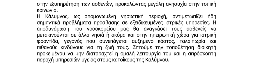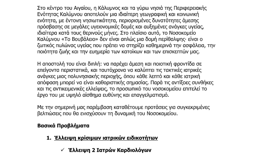 Στο επίκεντρο του εγγράφου βρίσκεται η επείγουσα ανάγκη ενίσχυσης των ιατρικών υπηρεσιών και υποδομών σε μια νησιωτική περιοχή με αυξημένες απαιτήσεις και περιορισμένη πρόσβαση σε δευτεροβάθμιες και τριτοβάθμιες υγειονομικές δομές. Η Κάλυμνος, λόγω της γεωγραφικής της θέσης και της ιδιαίτερης νησιωτικότητας που χαρακτηρίζει την περιοχή, βασίζεται κατά κύριο λόγο στο τοπικό της νοσοκομείο για την κάλυψη όλων των υγειονομικών αναγκών, από τα καθημερινά περιστατικά έως τις σοβαρές ιατρικές κρίσεις.