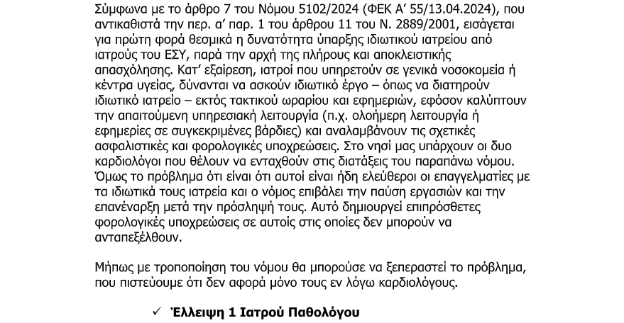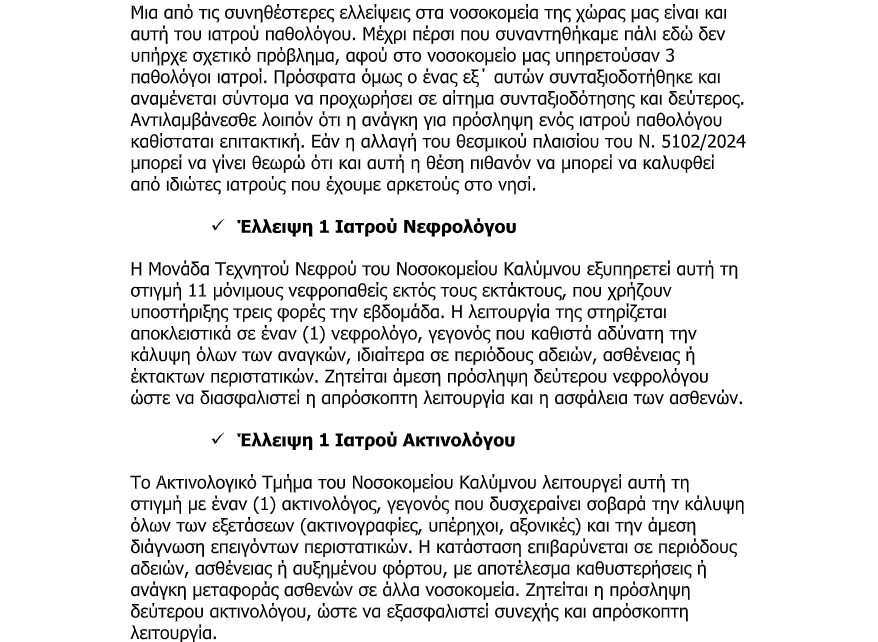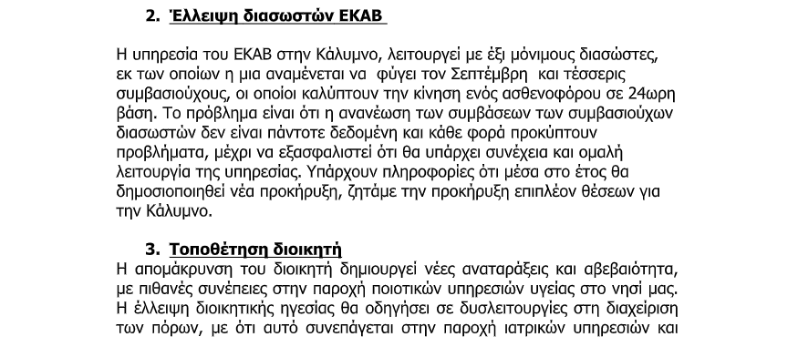 Το υπόμνημα καταδεικνύει τις δυσλειτουργίες και τις προκλήσεις που αντιμετωπίζει σήμερα το σύστημα υγείας στην Κάλυμνο και προτείνει ρεαλιστικές λύσεις, κάνοντας ειδική αναφορά στις δυνατότητες που δίνει το νέο θεσμικό πλαίσιο (Ν. 5102/2024) για ένταξη ιδιωτών ιατρών στο δημόσιο σύστημα υγείας. Ωστόσο, εντοπίζονται και συγκεκριμένα νομικά και φορολογικά εμπόδια που πρέπει να αρθούν άμεσα μέσω νομοθετικών παρεμβάσεων, ώστε να αξιοποιηθούν οι υπάρχοντες επαγγελματίες του νησιού προς όφελος της τοπικής κοινωνίας.