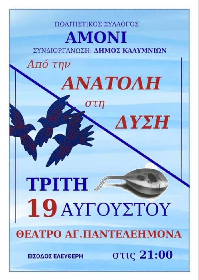Μια ξεχωριστή μουσική βραδιά υπόσχονται να χαρίσουν ο Πολιτιστικός Σύλλογος ΑΜΟΝΙ και ο Δήμος Καλυμνίων, την Τρίτη 19 Αυγούστου 2025, στις 21:00, στο γραφικό και φιλόξενο θέατρο του Αγίου Παντελεήμονα. Η εκδήλωση, με τίτλο «Από την Ανατολή στη Δύση», θα έχει ελεύθερη είσοδο, προσκαλώντας ντόπιους και επισκέπτες να απολαύσουν μια μαγευτική μουσική συνάντηση.