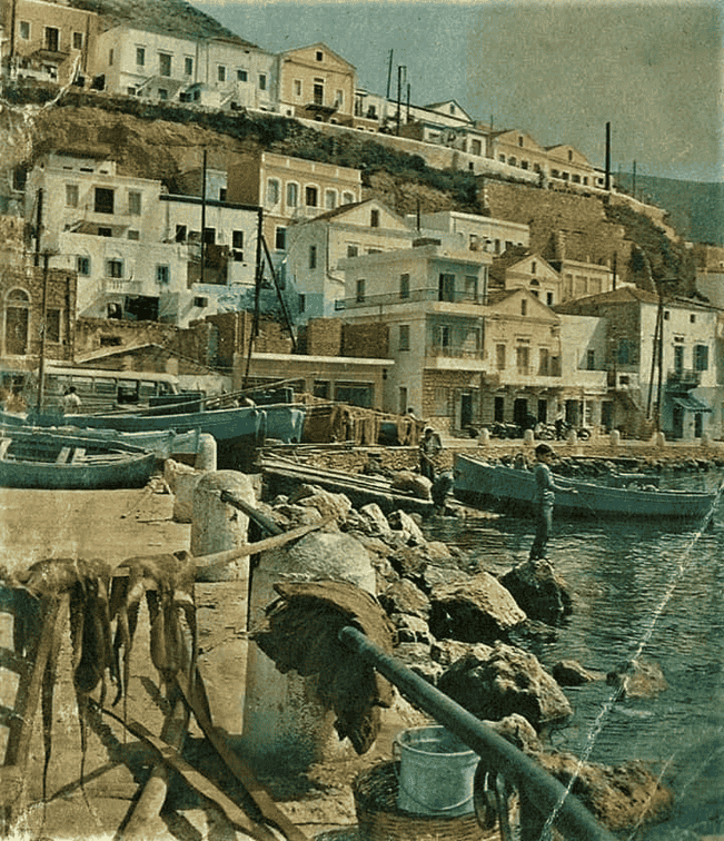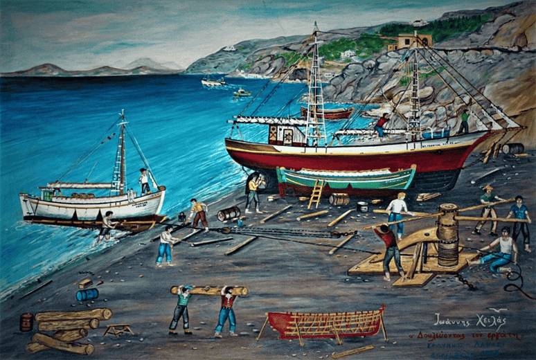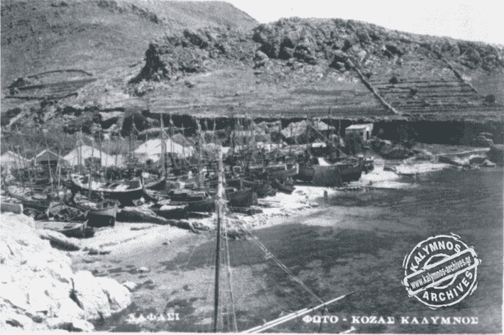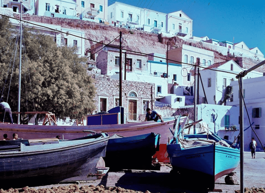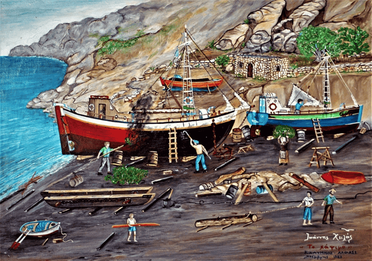 Δεκαετία του 1950, Σκηνή από το «τράβηγμα» (ανέλκυση) στο καρνάγιο, της Καλύμνου, σφουγγαράδικων πλεούμενων με τη βοήθεια «εργάτη» – βαρούλκου. Στο κόκκινο καραβόσκαρο, πληρώματα (ναύτες κουβέρτας – καταστρώματος), ανεβαίνουν ψηλά στα ξάρτια, συντηρούν τα άρμενα και μερεμετίζουν ό,τι χρειάζεται ένα πλεούμενο για να είναι αξιόπλοο και καλοταξίδευτο.