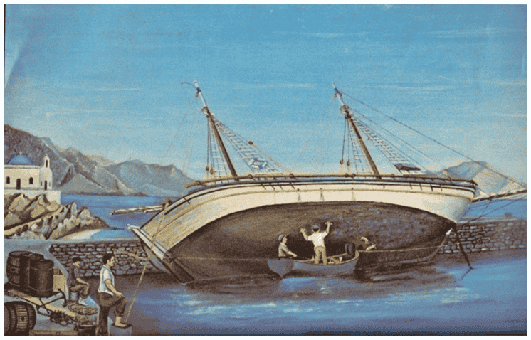 Σκηνή από συντήρηση πλεούμενου, που ενώ βρίσκεται στη θάλασσα, το «καρινάρουν» – το γέρνουν, εναλλάξ, μέχρι να φανεί η καρένα του και μετά να προχωρήσουν στον καθαρισμό και συντήρησή του