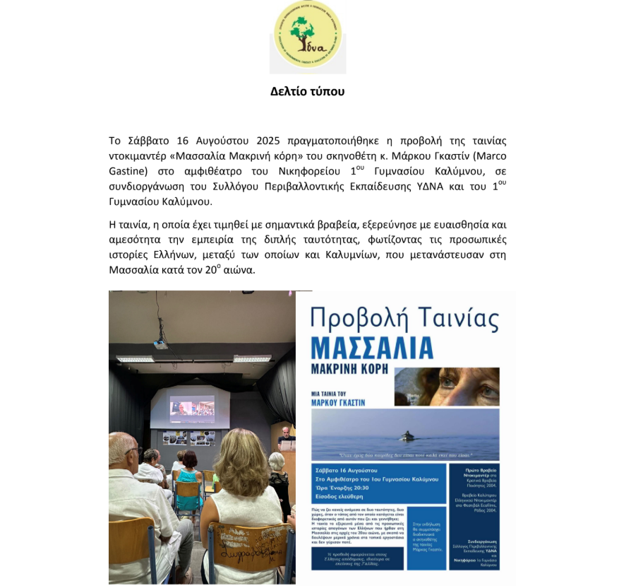 Με μεγάλη επιτυχία πραγματοποιήθηκε το Σάββατο 16 Αυγούστου 2025 στο αμφιθέατρο του Νικηφορείου 1ου Γυμνασίου Καλύμνου η προβολή της ταινίας–ντοκιμαντέρ «Μασσαλία Μακρινή κόρη» του σκηνοθέτη Μάρκου Γκαστίν.
